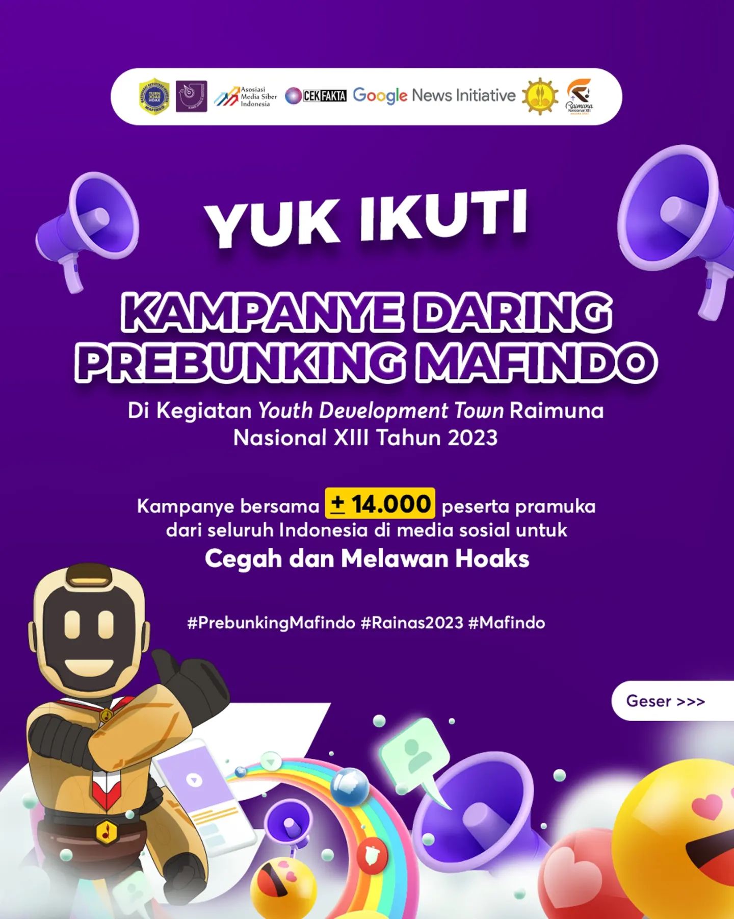 Hai hai, salam pramuka!Mafindo hadir di Kegiatan YOUTH DEVELOPMENT TOWN RAIMUNA NASIONAL XIII TAHUN 2023 Kami hadir melalui program Cek Fakta, memberikan pemahaman mengenai Prebunking ...